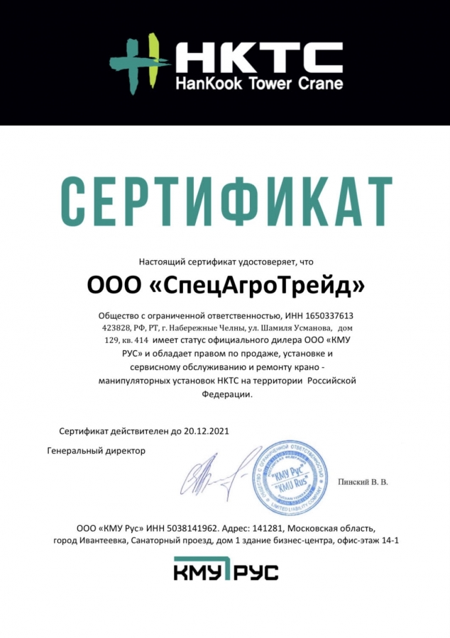 Сертификат официального дилера по кранам манипуляторам марки "HKTC".